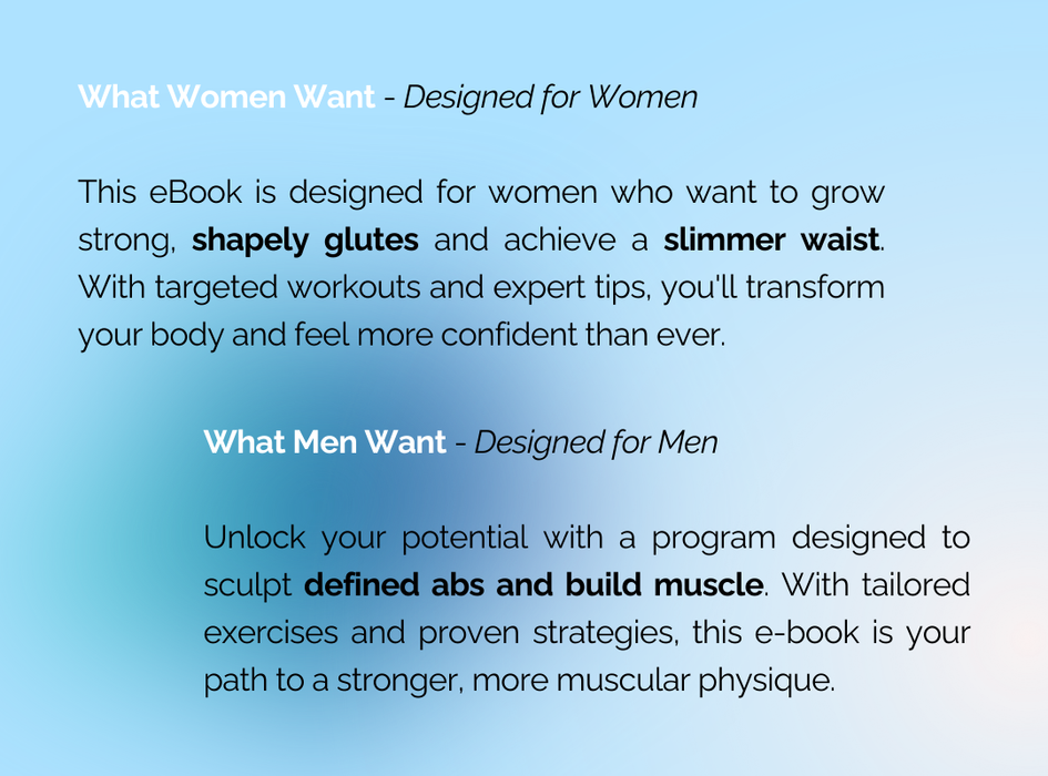 - What Women Want64.99$a step-by-step guide designed for women who want to lose fat, build muscle, and sculpt the perfect hourglass shape- ONE-TIME Fee, LIFETIME Access